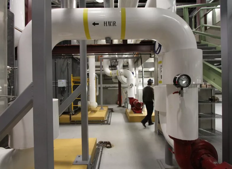 DES is a network of hot and cold water pipes, typically buried underground, that are used to efficiently heat and cool buildings. These types of systems typically use less energy than if the individual buildings served by them were to each have their own boilers and chillers. DES are historically served by fossil fuel burning equipment, but modernization of these systems can involve switching to geothermal energy.