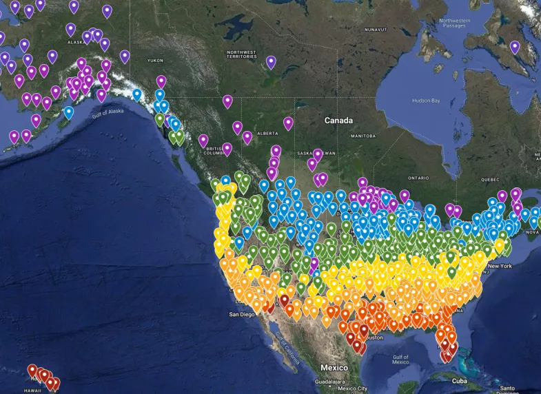 The climate map provides data related to the thermal enclosure and mechanical system performance levels required to achieve Phius CORE Prescriptive. It is similar to the same data as the Phius CORE Prescriptive snapshot, except it's displayed on a map. It is often helpful to use this map to find the location/climate data set closest to your project site.