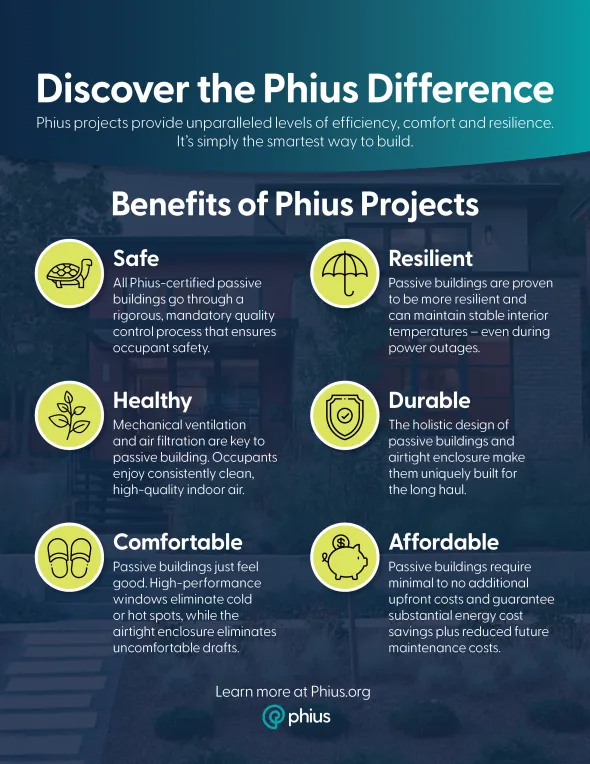 The messaging will shift when introducing passive building to someone such as a developer or policymaker, but the main idea remains the same — tell them what a Phius Certified building can do for them. In this case, they’re more likely interested in the long-term cost savings, reduced grid strain and resilience in the face of natural disasters and power outages. The connection with this audience is through the idea that Phius Certified buildings are valuable additions to their portfolio and ideal building blocks for growing communities.